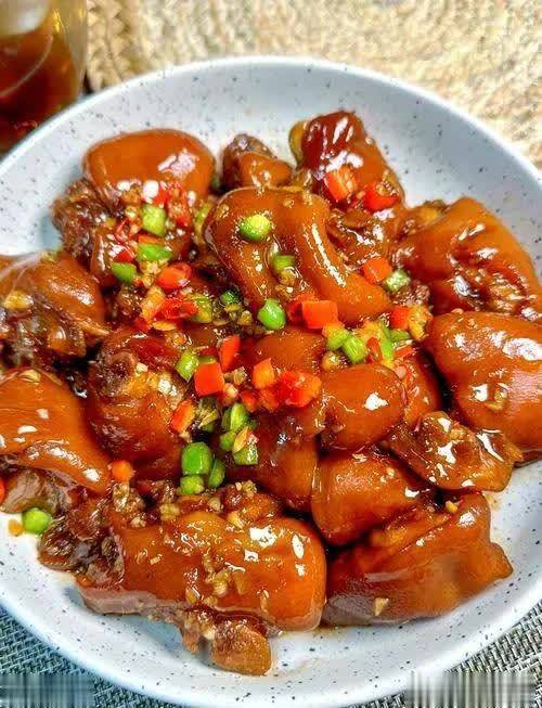 准备食材: 猪蹄、葱姜蒜、桂皮、八角、香叶、干辣椒、花椒粒、青红椒、葱姜蒜末。