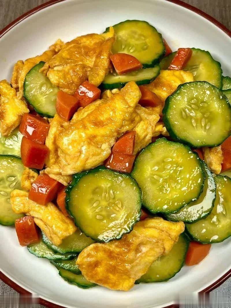 3、再次起锅烧油,油热后放入蒜末炒出香味,再放入黄瓜翻炒少顷,然后放入鸡蛋和火腿,加入生抽、蚝油调味,翻炒均匀炒至入味,即可出锅装盘开吃。